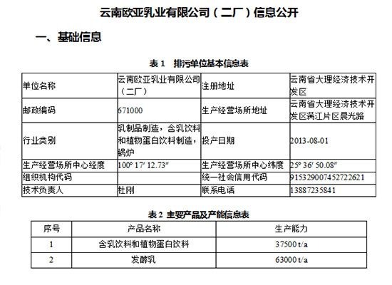 云南歐亞乳業有限公司(二廠)信息公開